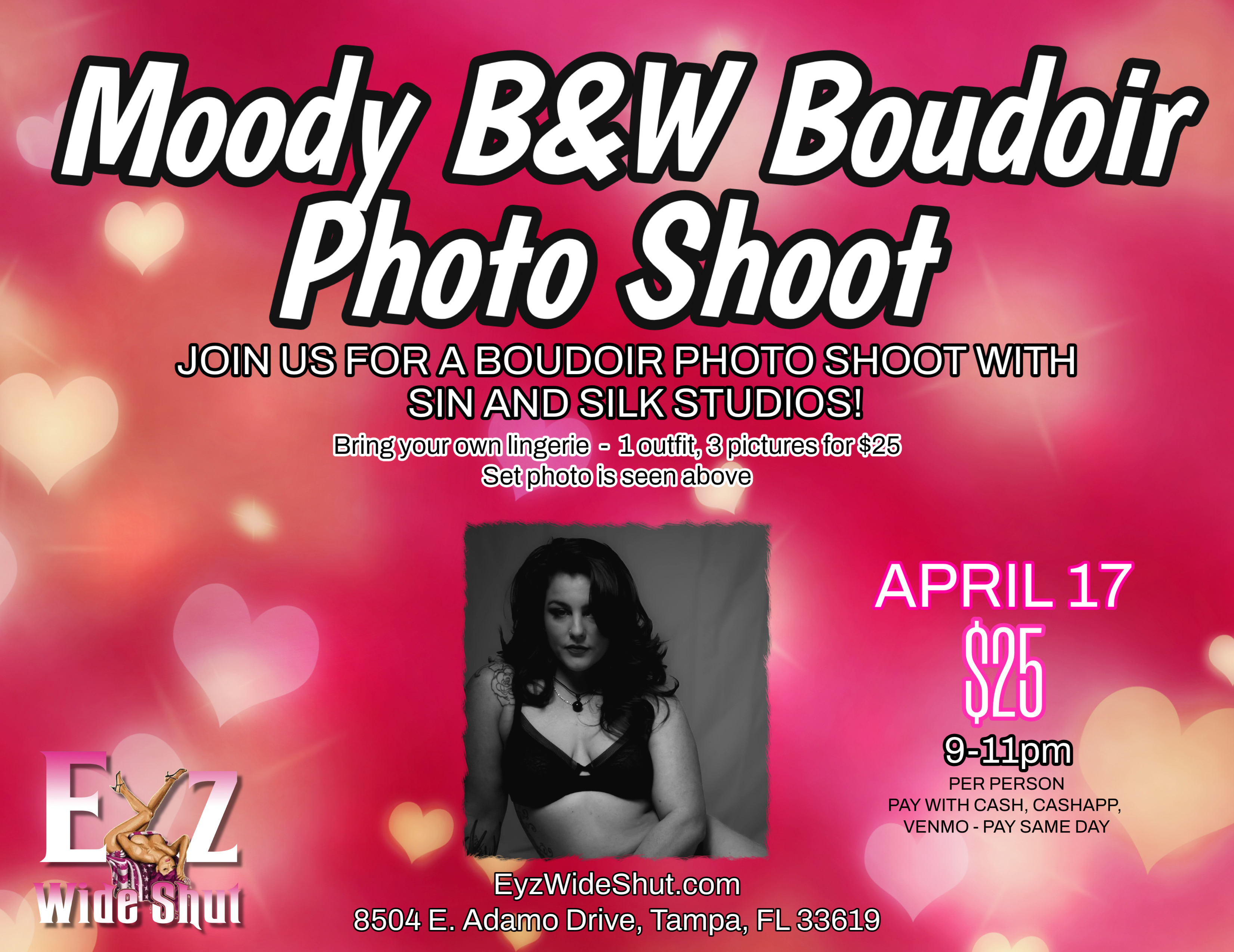 • Moody B&W Boudoir Photos in the middle bar with Sin & Silk Studios from 9PM-11PM $25 for 3 Boudoir Mini Photo Session